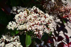 Les Photinias sont des arbustes d’une grande versatilité. Ils peuvent être modelés comme des haies, ou être laissés à pousser librement comme des arbustes isolés, voire comme des petits arbres. Leur croissance est intermédiaire, poussant généralement entre 3 et 5 mètres de hauteur. Leur feuillage est sans aucun doute la caractéristique la plus remarquable, avec des feuilles coriaces et des nouvelles pousses rougeoyantes au printemps qui se transforment en vert profond à mesure qu’elles mûrissent. Les branches sont garnies de fleurs blanches en grappe pendant le printemps et l’été, qui, en plus d’être visuellement attrayantes, dégagent également un parfum doux et agréable. Ces fleurs sont ensuite remplacées par des baies rouges, ajoutant ainsi une autre couche de texture à l’apparence de l’arbuste.