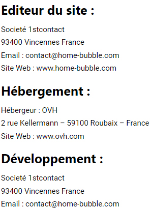 Merci de lire avec attention les différentes modalités d’utilisation du présent site avant d’y parcourir ses pages. En vous connectant sur ce site, vous acceptez sans réserve les présentes modalités. Aussi, conformément à l’article n°6 de la Loi n°2004-575 du 21 Juin 2004 pour la confiance dans l’économie numérique, les responsables du présent site www.home-bubble.com sont :